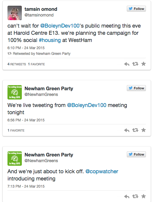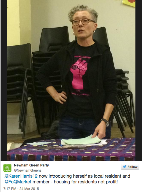Tonight there was a meeting at the Harold Centre about the Boleyn Development. Over 50 people attended, many speaking passionately and with a real sense that the housing crisis in Newham needs to be challenged urgently. Newham Green Party members were there to support the campaign, including Tamsin Omond, our Green Party candidates for East Ham.